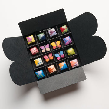 Our pretty butterflies are milk and dark chocolate filled with Salted Caramel, with the squares an assortment of our current selection. Should you wish to have only dark chocolates, or milk chocolates, please tell us in the checkout dialogue box.