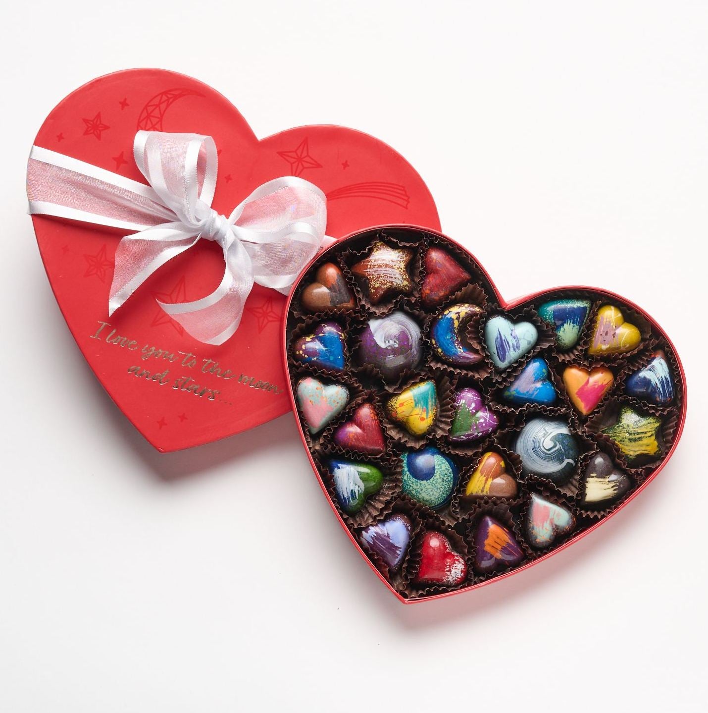 New gorgeous box! Our oh so special celestial box with a pretty moon, big hearts, sparkly stars, three planets and myriad dark and milk chocolate hearts from our current collection. A luxurious box of 26 large and medium chocolates from our 2026 collection, guaranteed to melt your sweetie's heart...