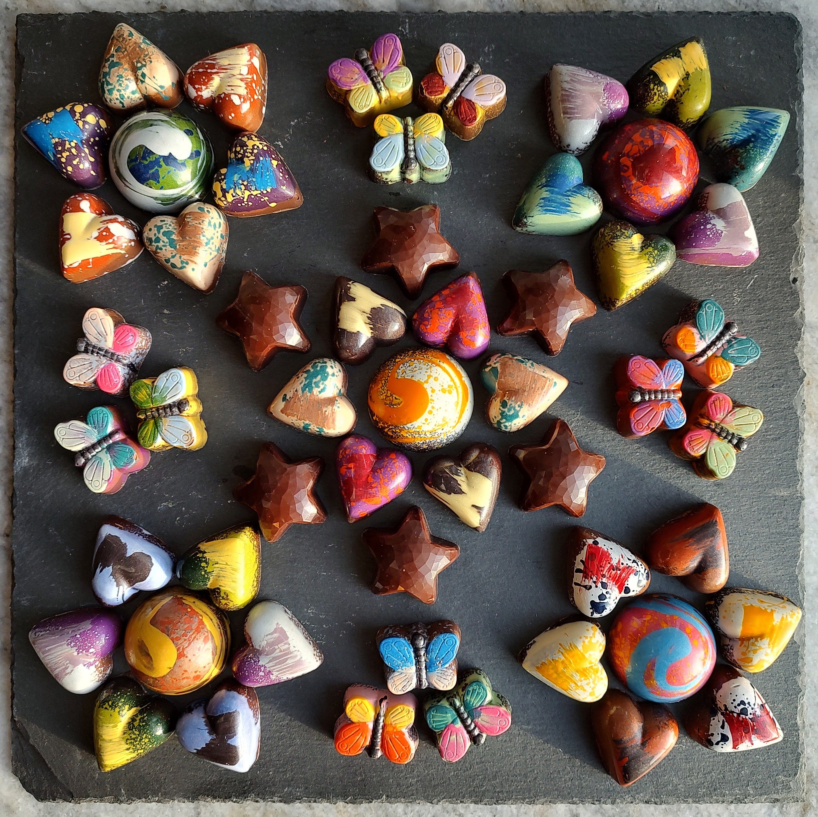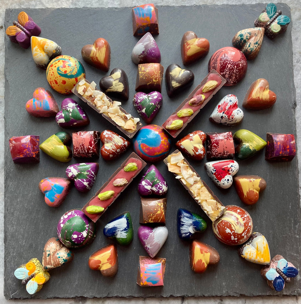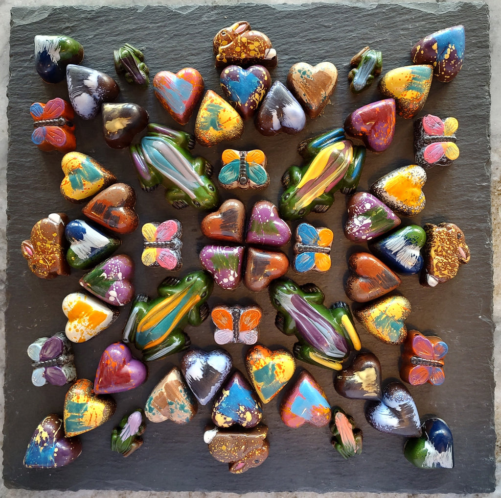 Our 5 Suns Tray holds a large number of medium chocolates and many butterflies (about 54 chocolates). The Classic Tray has a selection of chocolates as well as four of our mini bars. Our Critters Tray has a rich mix of items (about 54 chocolates), including many large chocolates. Feel free to tell us what you would like on your tray, including vegan items.