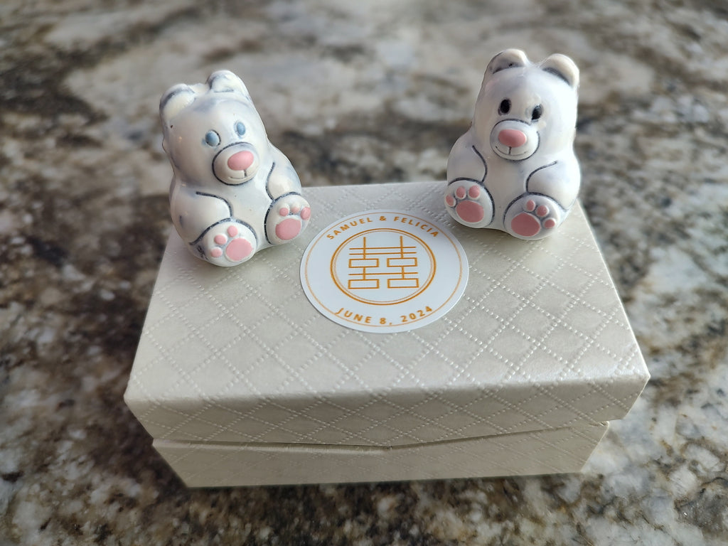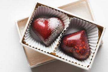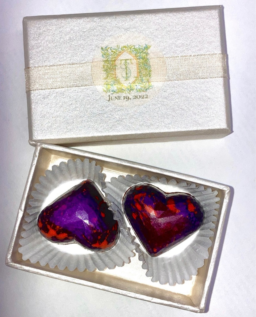 Our two chocolates custom box will hold the two chocolates of your heart's desire. They can be done with a special mold, or painted in your wedding colors. You are welcome to choose your two favorite chocolate flavors from our current collection to fill your custom chocolates. Note that we have a minimum order of 100 boxes for this custom order. If you need fewer, you are welcome to use this box with our core collection chocolates in hearts or squares.