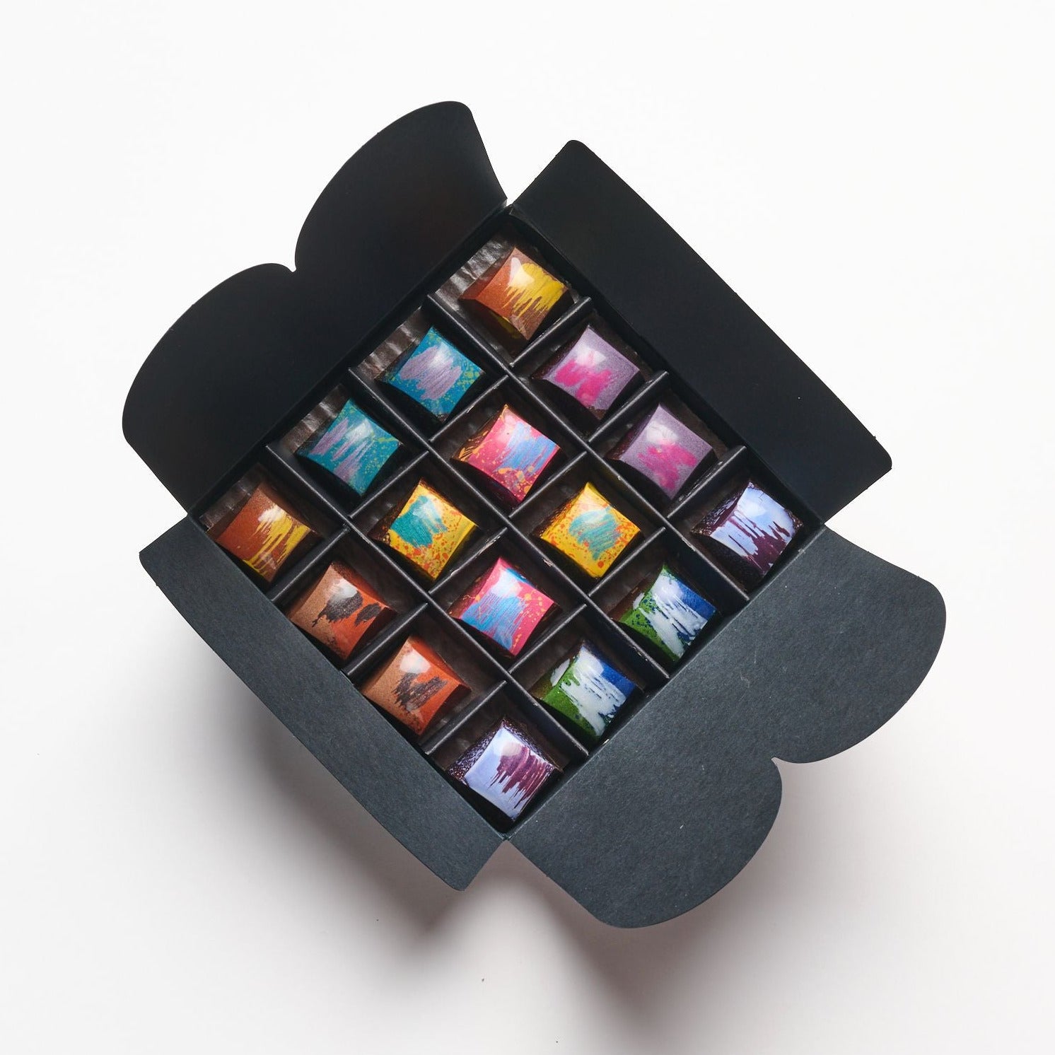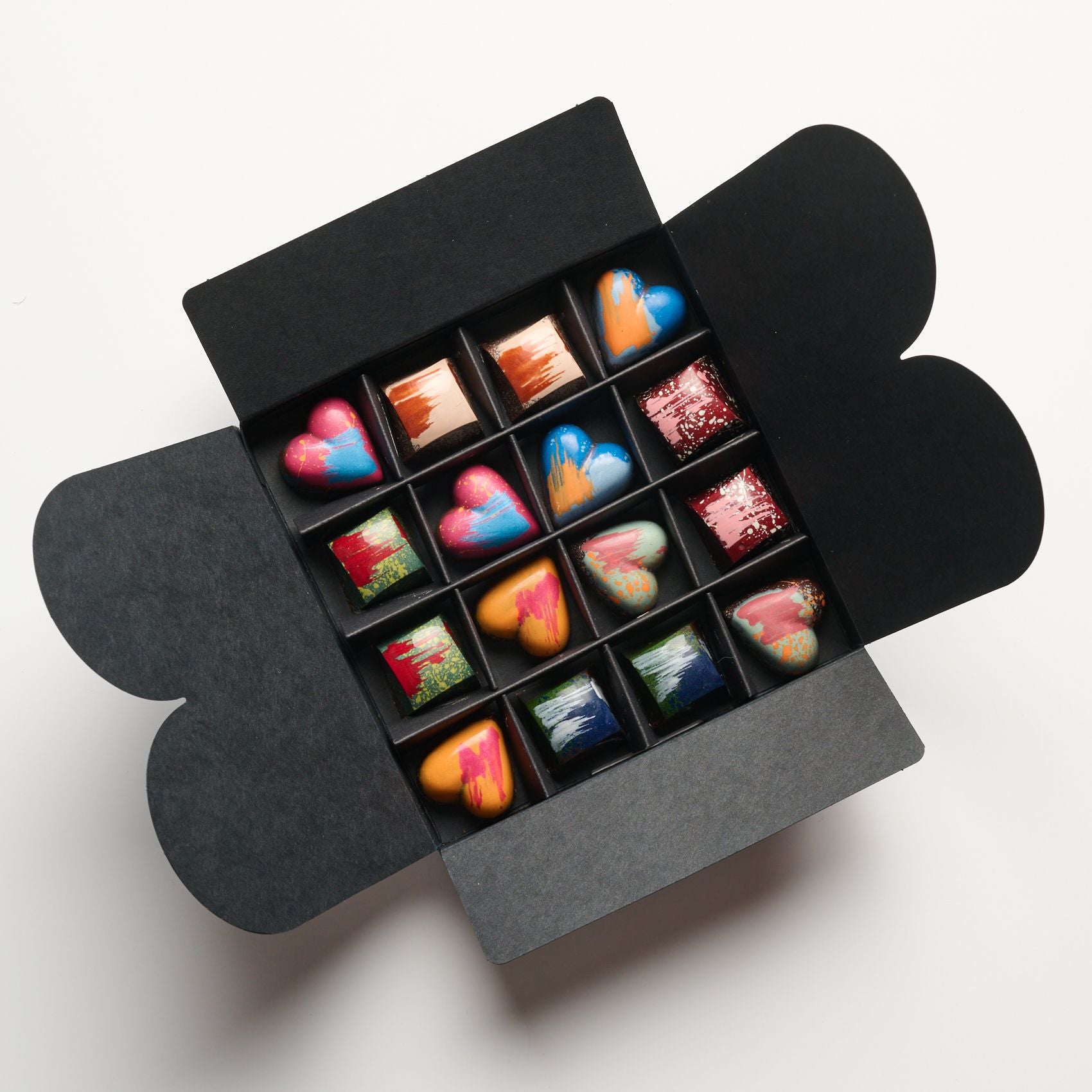 Our 16 Chocolats box is the perfect lavish gift. It holds a wide assortment of our current flavors in dark and milk chocolate. Should you wish for all dark or all milk, please tell us in the checkout dialogue box, and provide us with your gift message.