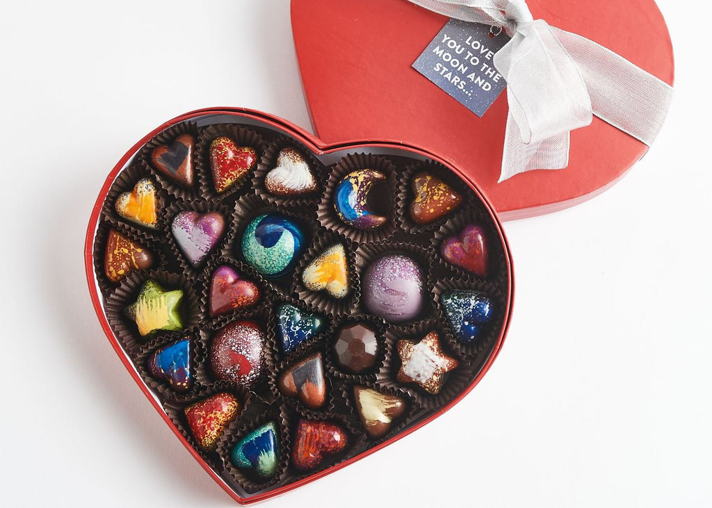 New gorgeous box! Our oh so special celestial box with a pretty moon, big hearts, sparkly stars, three planets and myriad dark and milk chocolate hearts from our current collection. A luxurious box of 26 large and medium chocolates from our 2026 collection, guaranteed to melt your sweetie's heart...