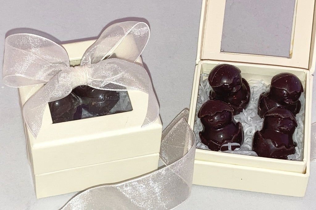 Four dark chocolate Chicks filled with our gorgeous marzipan are nestled in a pretty ivory box with a festive ribbon. VEGAN