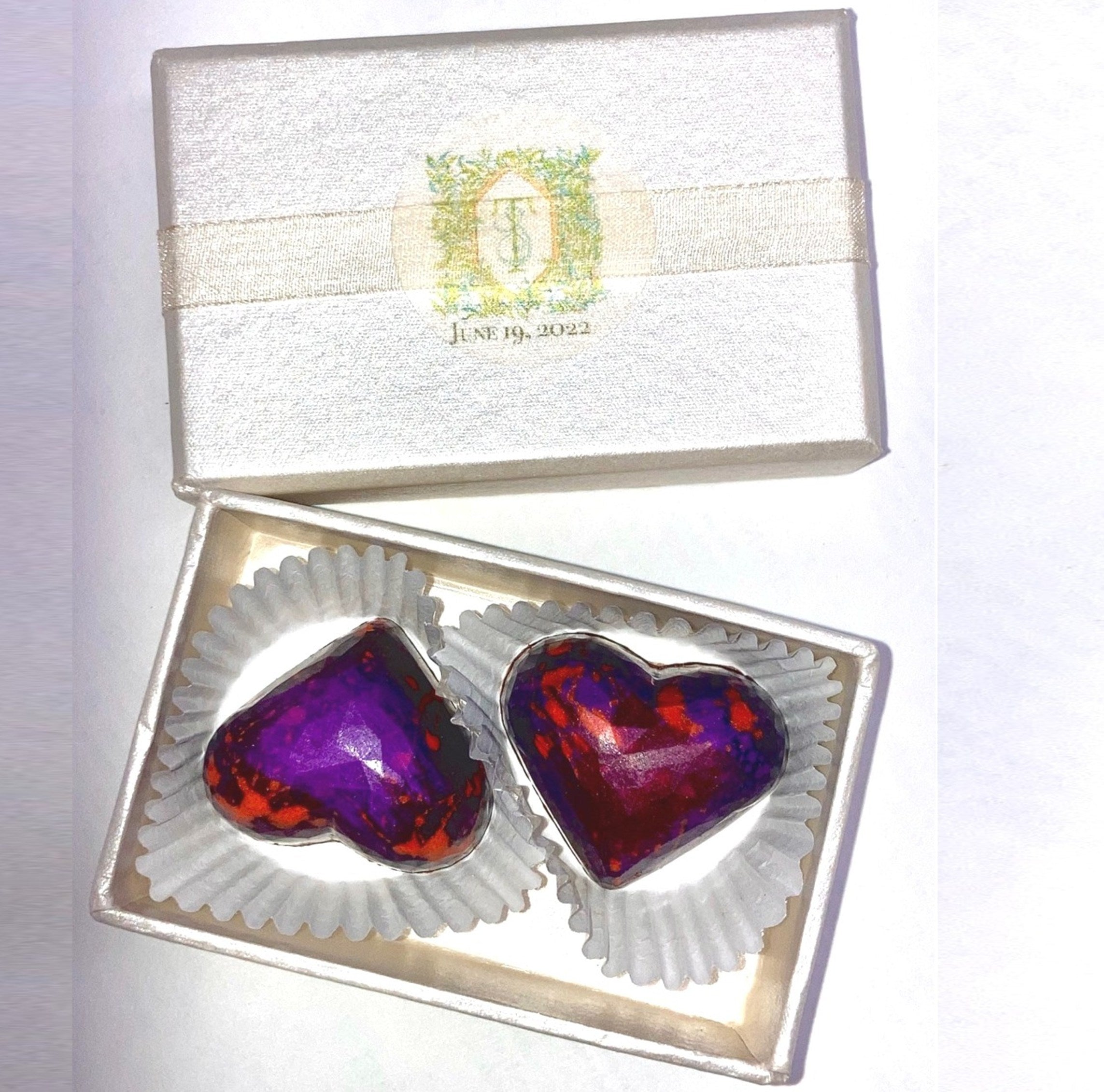 Our two chocolates custom box will hold the two chocolates of your heart's desire. They can be done with a special mold, or painted in your wedding colors. You are welcome to choose your two favorite chocolate flavors from our current collection to fill your custom chocolates. Note that we have a minimum order of 100 boxes for this custom order. If you need fewer, you are welcome to use this box with our core collection chocolates in hearts or squares.